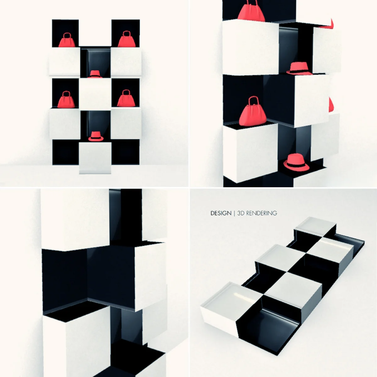 Cubic mirrored plinths were designed for this monochrome display where each element has a different height to play with perception.